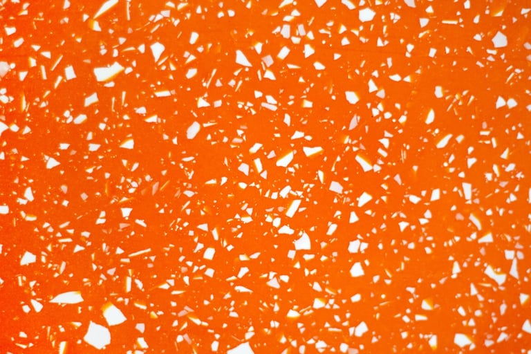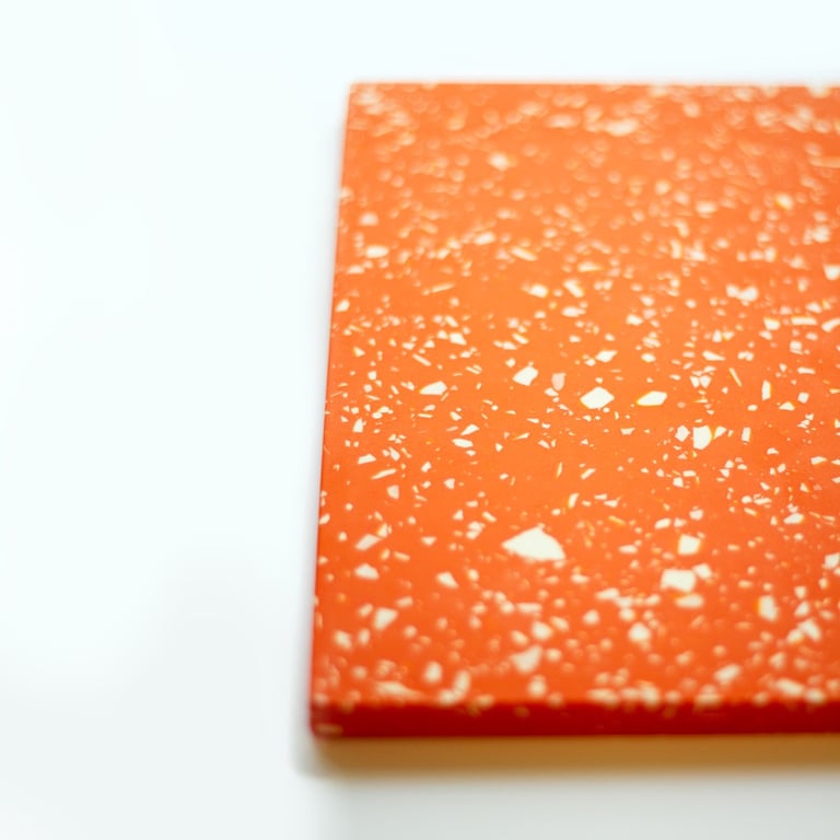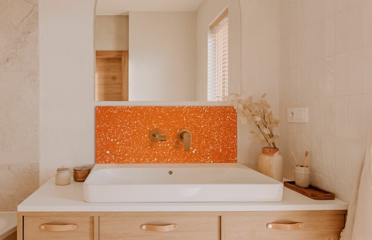 Cette crédence sur mesure allie un orange pop dynamique à un terrazzo blanc élégant, pour un contraste moderne et lumineux. Réalisée en éco-résine, elle est résistante à l’eau et à la chaleur, facile à entretenir et entièrement façonnée à la main, pour une pièce unique et personnalisée.
